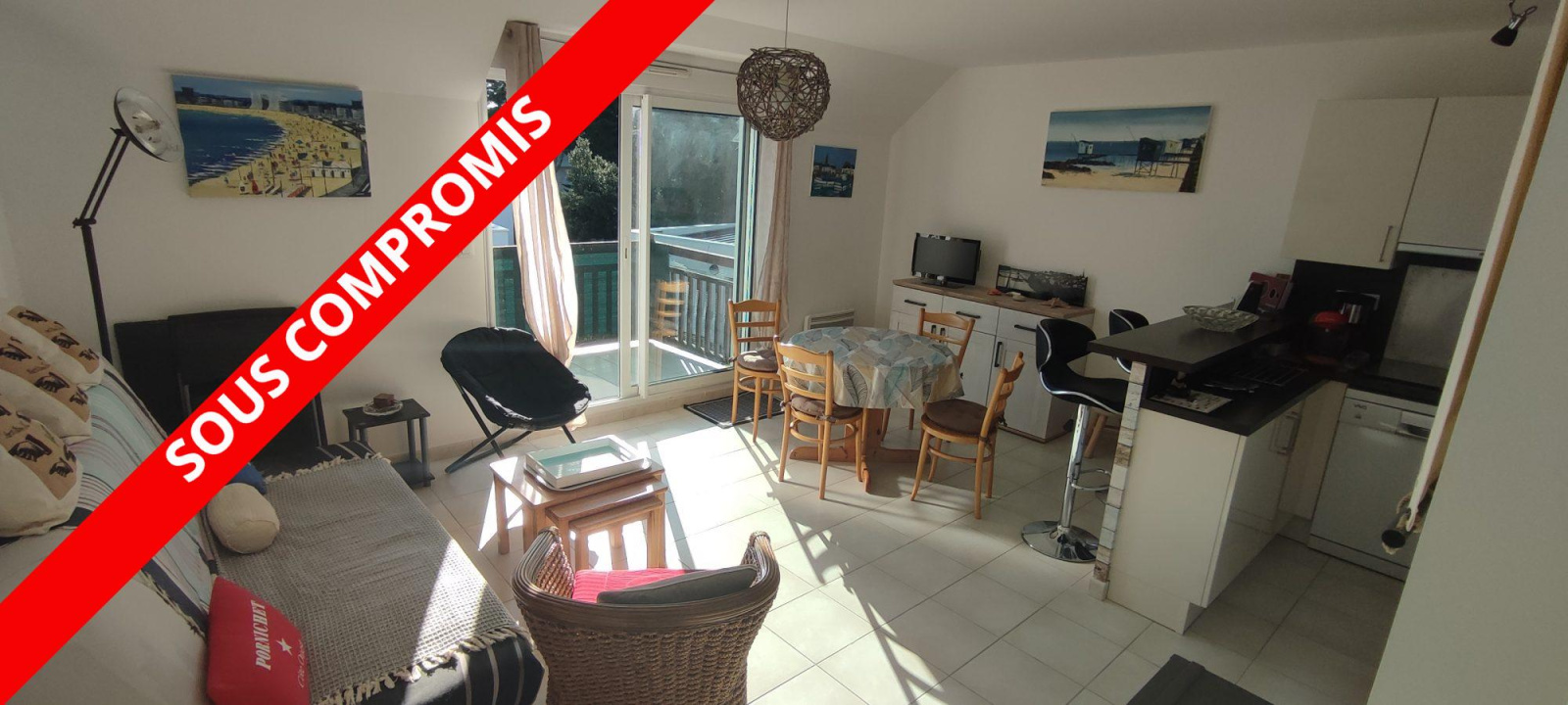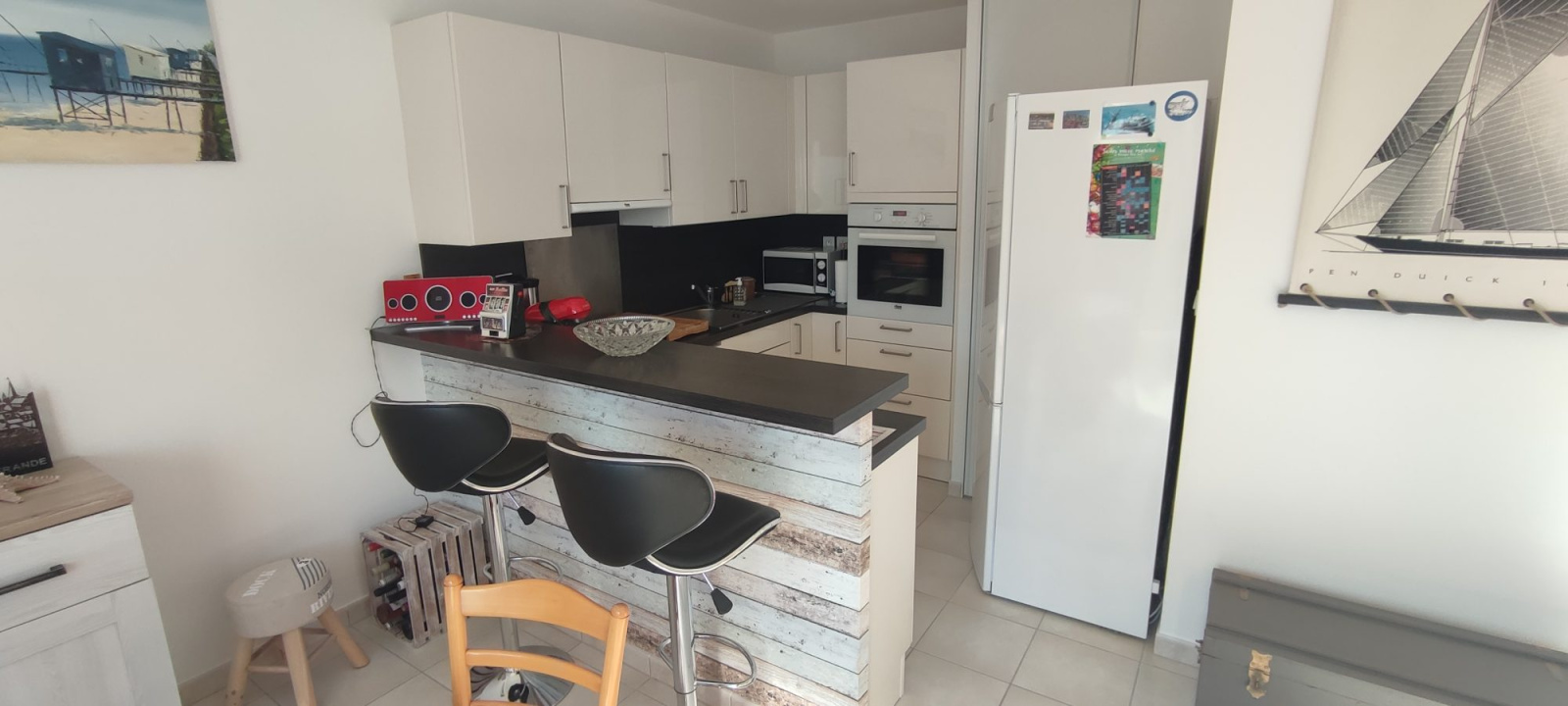 Bel appartement traversant de 65m2 plein sud avec garage dans petite copropriété à 10 minutes à pieds du marché, et 15 minutes de la plage. Au premier et dernier étage sans ascenseur, il offre : - une grande entrée, - une chambre spacieuse et lumineuse avec balcon et dressing attenant. - Une chambre exposée ouest avec balcon attenant. - une salle d'eau - un WC indépendant - un grand séjour avec cuisine américaine aménagée et équipée. - une terrasse de 6m2 exposé plein sud Un garage (box fermé) de 25m2 vient compléter le bien. Belle prestations, à voir !