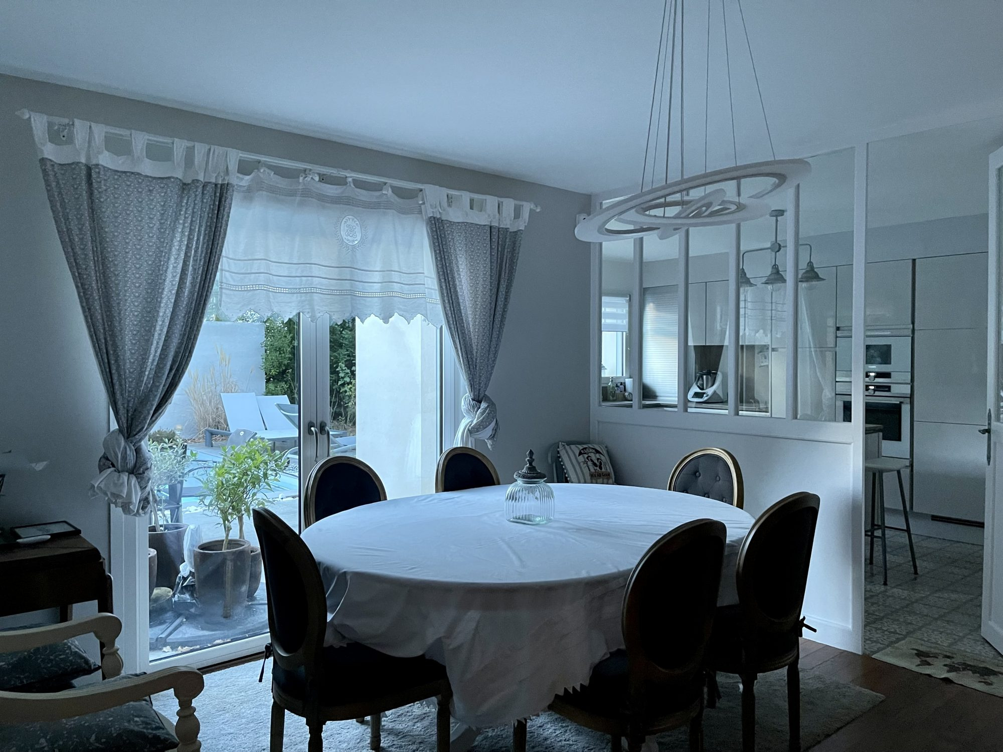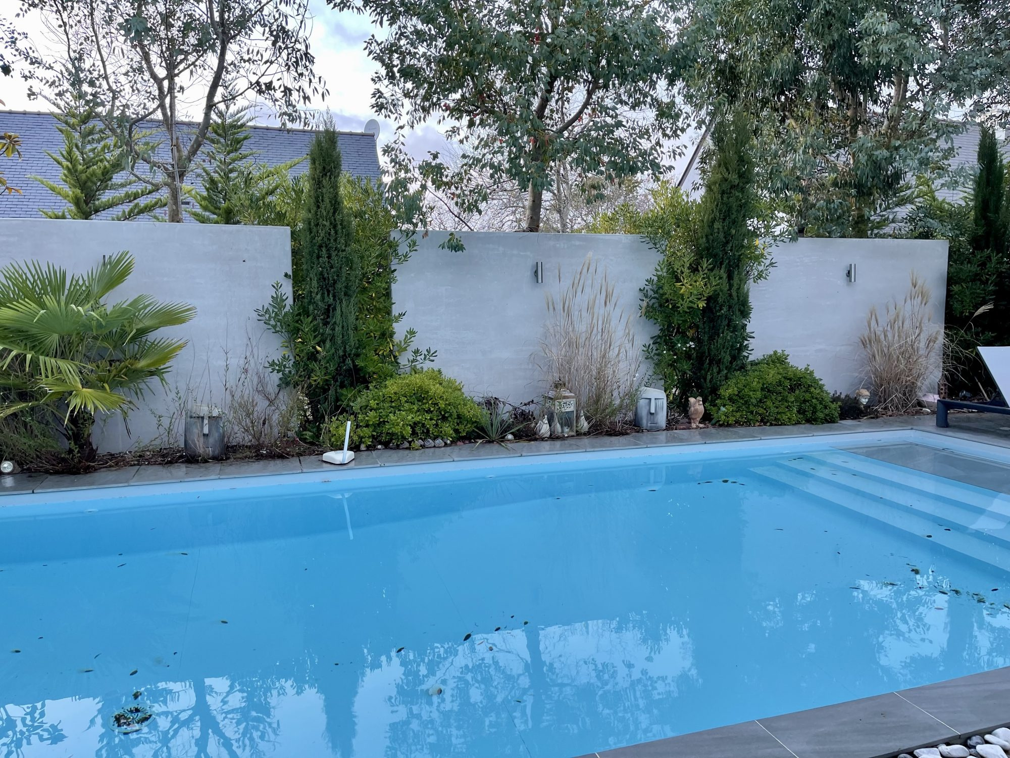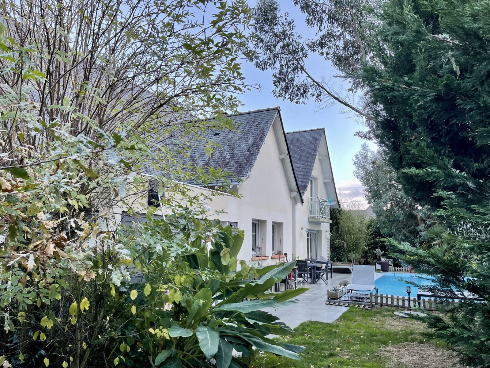 Grande et belle maison d'environ 180 m2 avec piscine à débordement, construite en 2018, sur un terrain aménagé et arboré de 1350 m2, dans le hameau de Brezéan à Guérande. La maison offre au rez-de-chaussée : - deux salons avec chacun sa cheminée, donnant sur le jardin, - une salle à manger, - une magnifique cuisine semi-ouverte (verrière) parfaitement équipée. - un bureau, - un appartement parental : imposant dressing en entrée, chambre, salle de bains , - un WC. A l'étage : - quatre chambres autour du palier, - un WC - - une salle de bains. Un garage double, un garage à vélo, des espaces couverts et une piscine à débordement viennent la compléter. La maison est en excellent état, et les prestations sont de très grande qualité (parquet en bois massif). Chauffage par aérothermie.