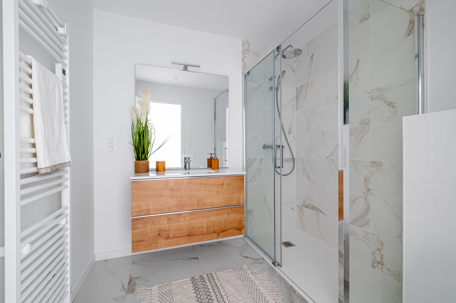 Exceptionnel : Appartement T3 neuf traversant de 69,5 m² orienté plein sud, situé au 1er et dernier étage d'une petite copropriété en plein coeur de la Baule, à 2 minutes à pied du marché et de l'avenue de Gaulle, 5 minutes de la gare. L'appartement se compose de : - un dégagement d'entrée - un grand séjour très lumineux (double exposition) ouvert sur un balcon exposé Sud sans vis-à-vis par de larges baies vitrées - une cuisine aménagée et équipée ouverte sur le séjour - une suite parentale avec salle d'eau et douche à l'italienne - une chambre - une seconde salle d'eau avec douche à l'italienne - un WC indépendant Les deux chambres s'ouvrent sur un balcon avec un escalier d'accès extérieur. L'appartement dispose d'une place de stationnement privative dans la cour. Rénovation et matériaux de standing. Rare à la vente dans le quartier du marché (rue peu passante en sens unique). 2 autres appartements en vente dans l'ensemble (T2 / T3 - 56 à 70 m2).