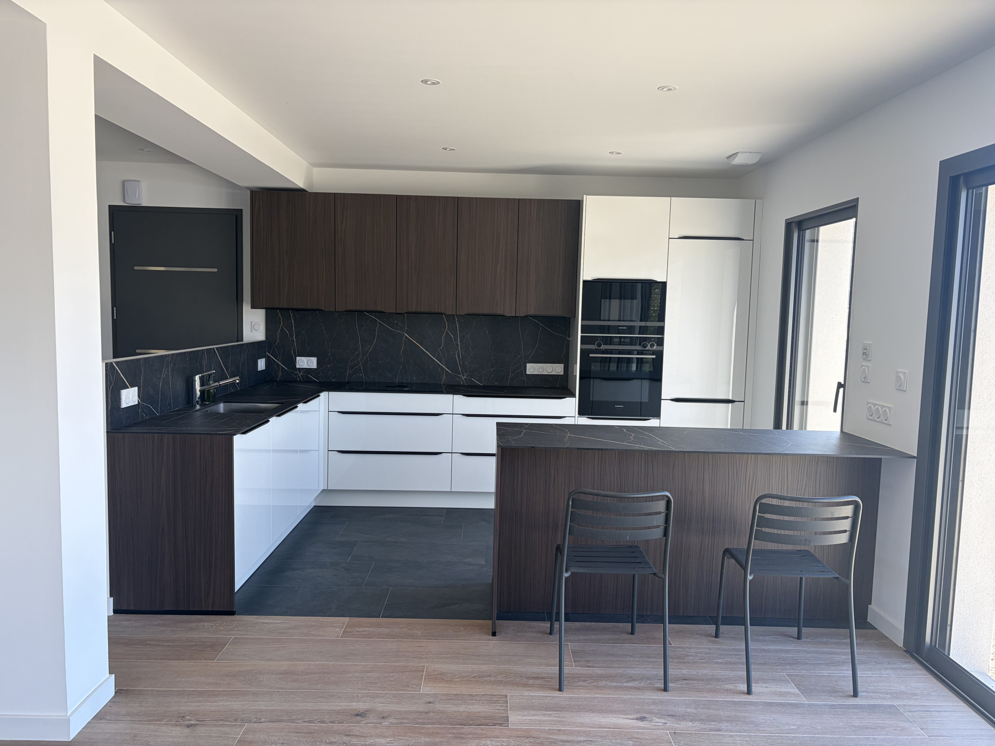 - Une cuisine aménagée et équipée présentant de belles préstations boisées et des équipements éléctroménager de marque.